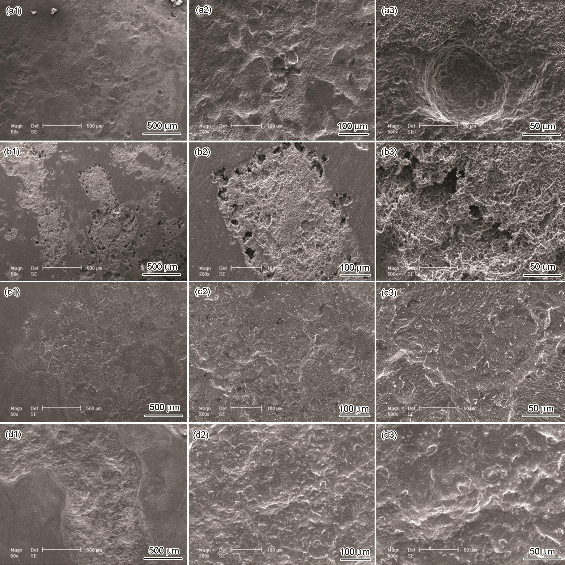 | Fig.9 SEM images of X65 steel corrosion morphology after dynamic AC interference test: (a1~a3) without CP, 100 A/m2 AC; (b1~b3) without CP 300 A/m2 AC; (c1~c3) CP+100 A/m2 AC; and (d1~d3) CP+300 A/m2 AC |