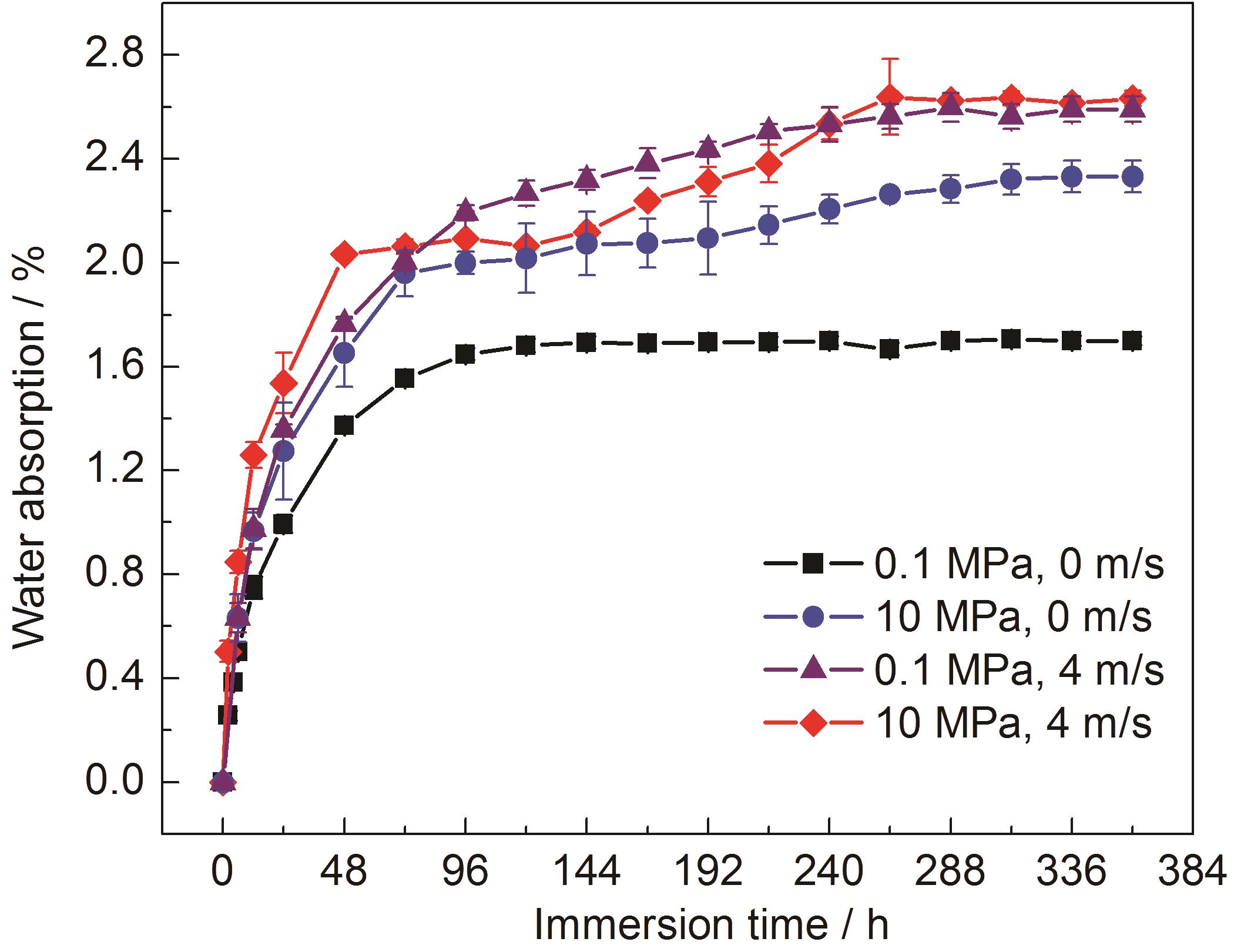 Fig.3 Water absorption curves for the free film samples under 0.1 MPa-0 m/s, 0.1 MPa-4 m/s, 10 MPa-0 m/s and 10 MPa-4 m/s environment |