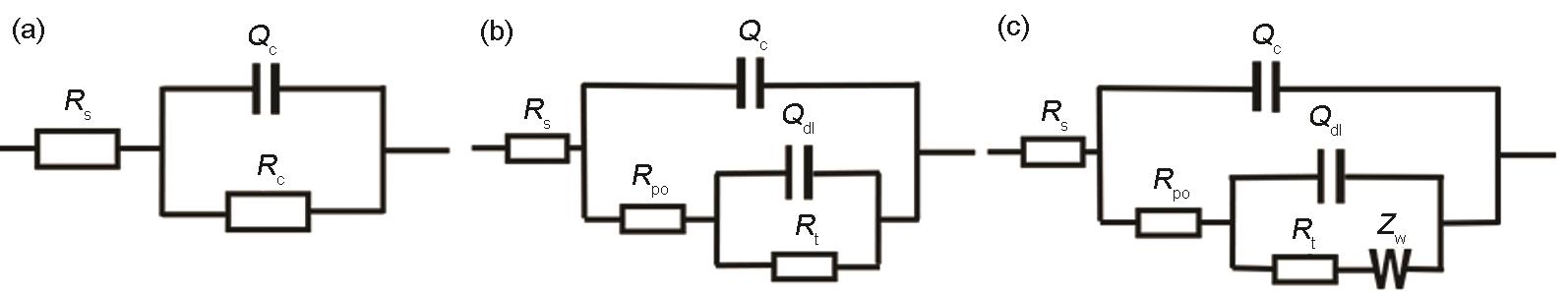 Fig.6 Equivalent electrical circuits of the coating/steel system: (a) model A, (b) model B, (c) model C |