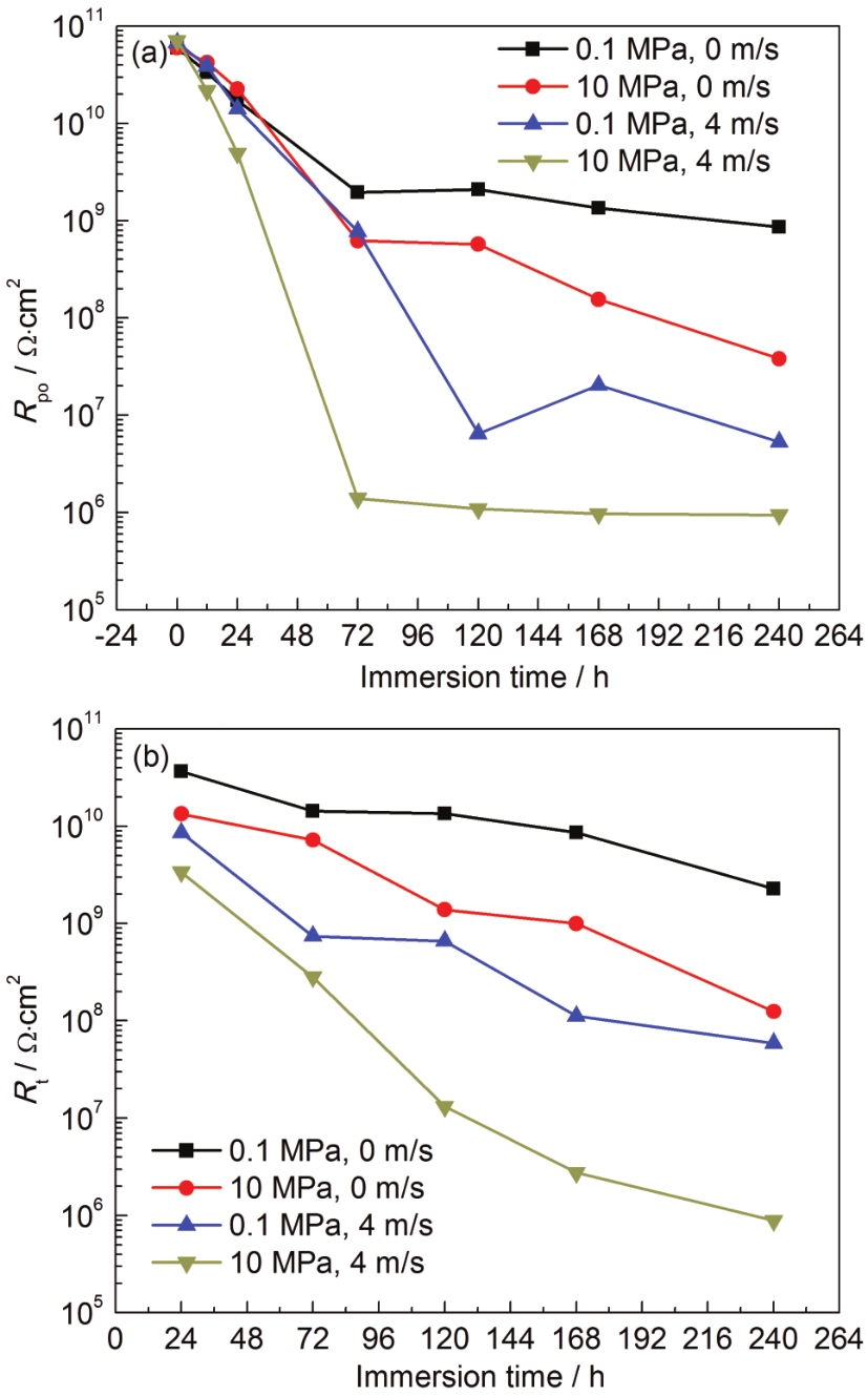 Fig.10 Coating resistance (a) and charge-transfer resistance (b) curves as a function of immersion time under different environment |