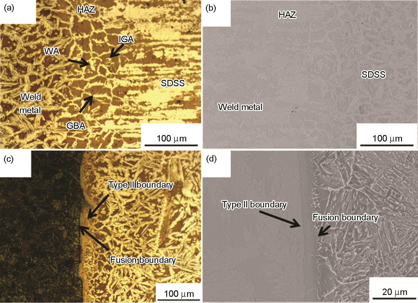 | Fig.3 OM (a, c) and SEM (b, d) images of WM/2507 SDSS (a, b) and WM/X80 steel interface (c, d) side transition region |