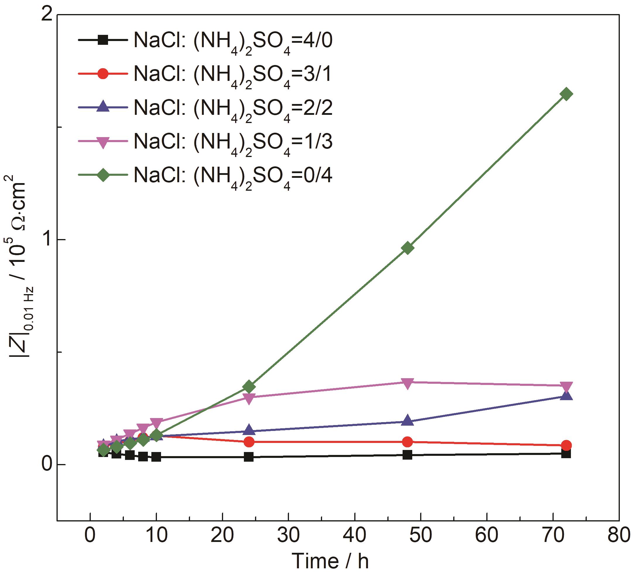 | Fig.5 Time dependences of low-frequency impedance |Z|0.01 Hz of the comb-like electrodes with surface deposition of different proportions of salt particles during exposure at 30 ℃ and RH90% |