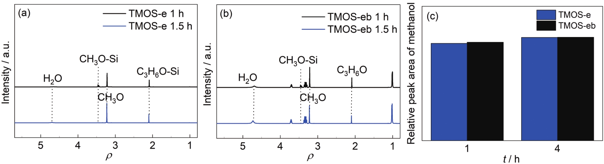 | Fig.8 1H NMR spectra (a, b) and integral area (vs. acetone) of methanol peaks (c) of TMOS-e and TMOS-eb solutions after hydrolysis for 1 and 1.5 h |