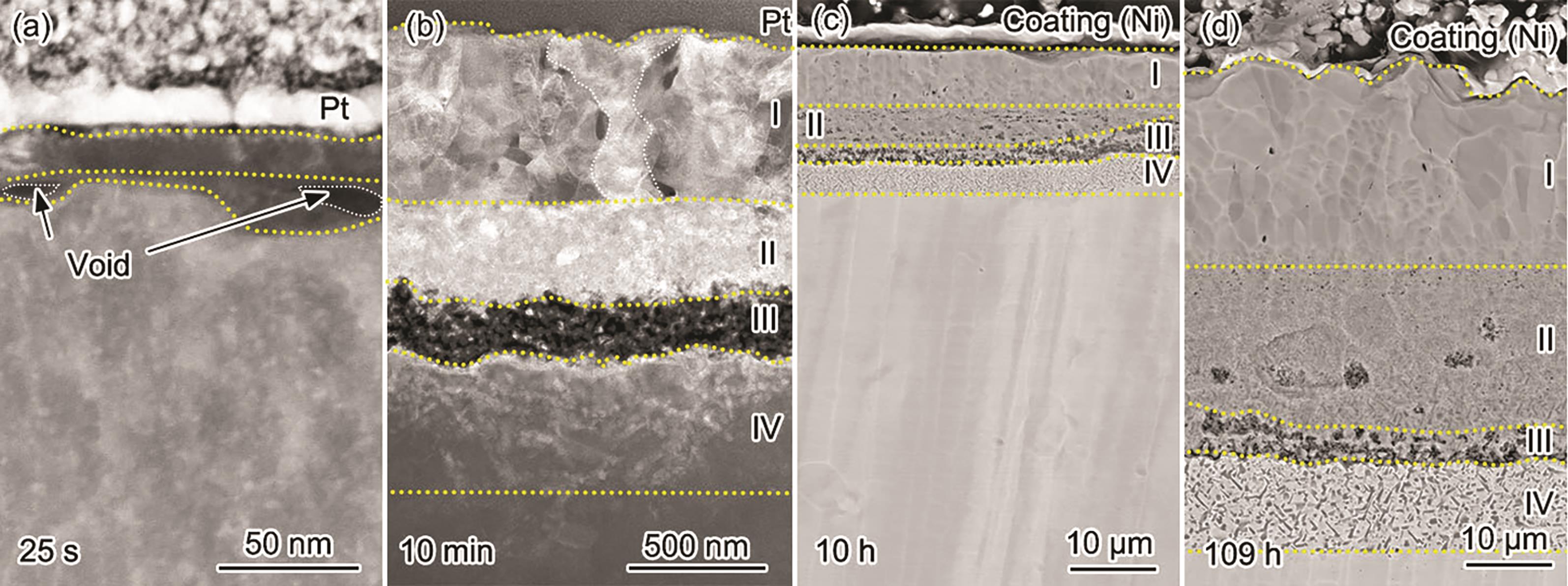 Fig.3 Cross-sectional morphologies of coarse-grained Ni-12Cr alloy at 800 ℃ in air for 25 s (a), 10 min (b), 10 h (c) and 109 h (d) |