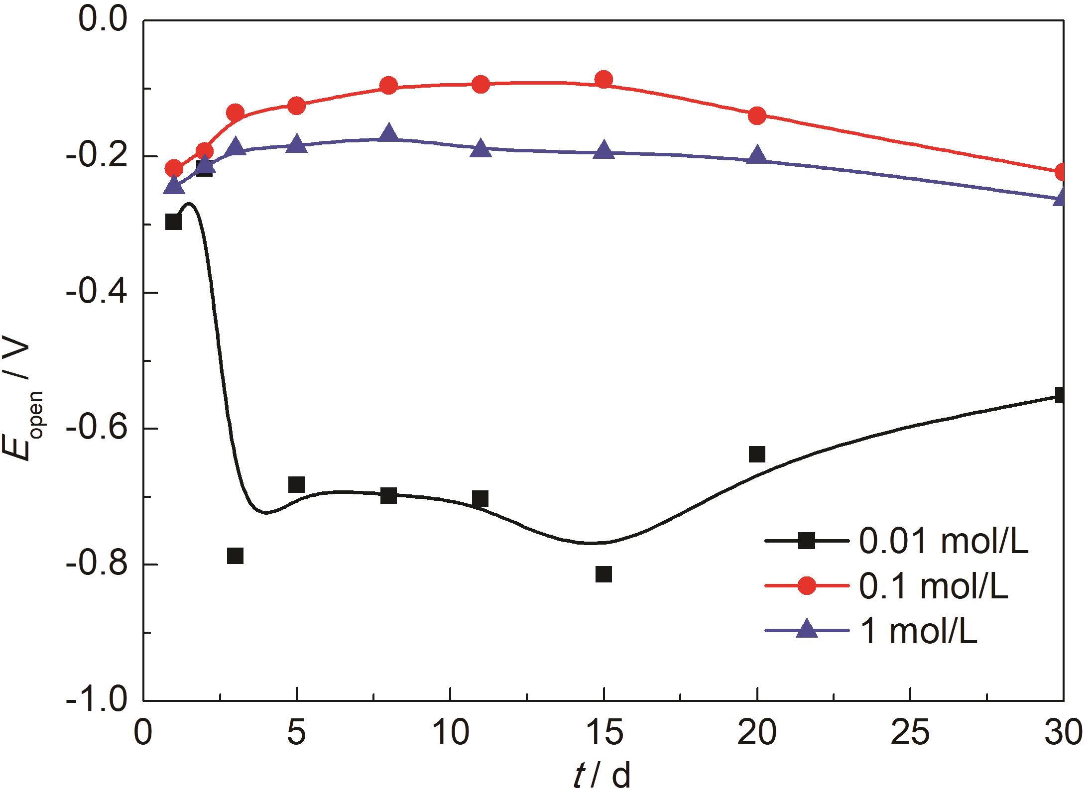 | 图2 Q235钢在不同浓度NaHCO3溶液中浸泡30 d过程中开路电位随时间的变化 |