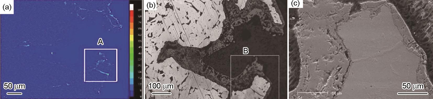 | Fig.6 Images of Cu rich phase in penetrating crack: distribution of Cu in area A (a), optical microstructure (area A in Fig.6a) (b) and SEM image of area A in Fig.6a (c) |