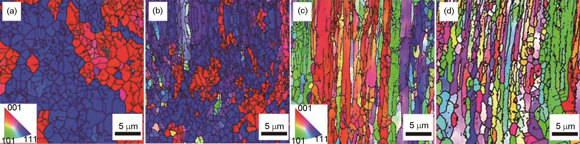 | Fig.5 Microstructure characterization of Al-Mg-Si alloy wires with 55.3% (a, c) and 84.7% (b, d) area reduction by EBSD |