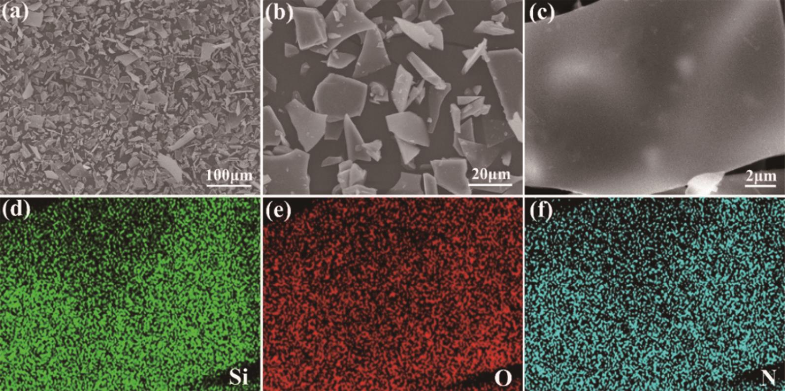 | Fig.2 SEM images of MB scales at low (a) medium (b) and high (c) magnifications, and EDS surface scannings of Si (d), O (e) and N (f) |