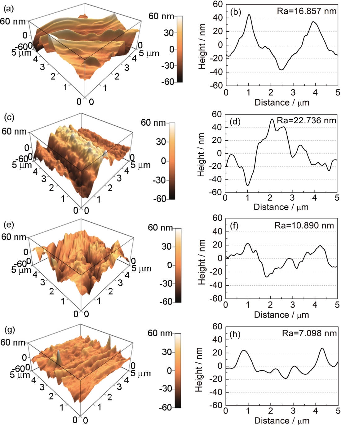 | Fig.1 AFM morphologies (a, c, e, g) and surface roughnesses (b, d, f, h) of L80 (a,b), L80Cr13 (c, d), 22Cr (e, f) and 25Cr (g, h) steels after removing the corrosion product layers |