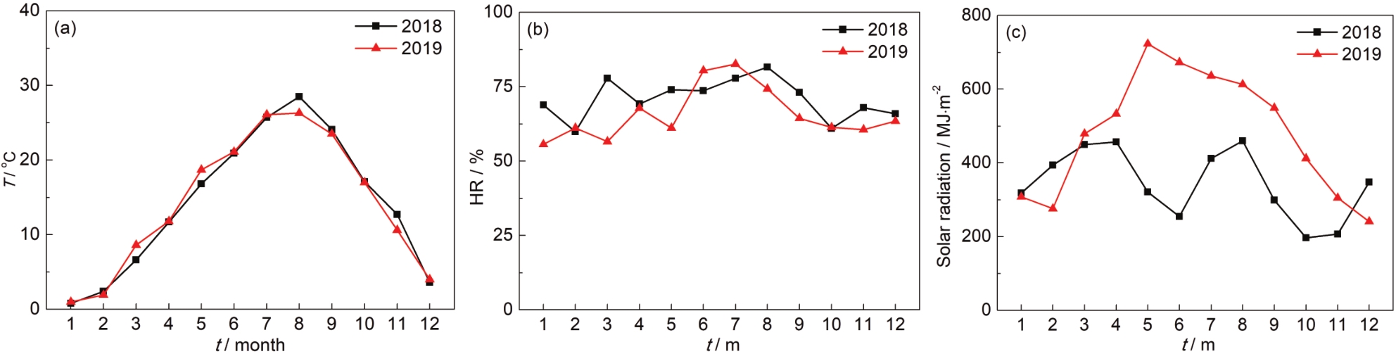 Fig.1 Atmospheric temperature (a), relative humid (b) and solar radiation (c) data of Qingdao test station during the test period |