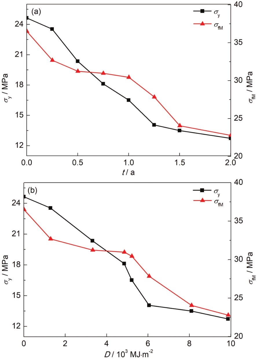 Fig.2 Changes of mechanical properties of polyethylene with aging time (a) and solar radiation (b) |
