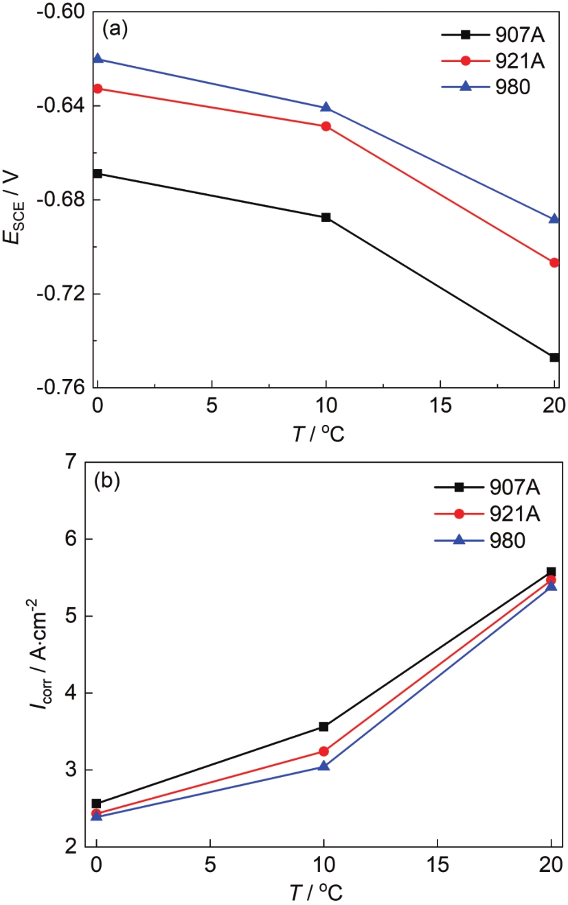 | Fig.3 Open circuit potentials (a) and corrosion current densities (b) of three low-alloy steels as functions of temperature |