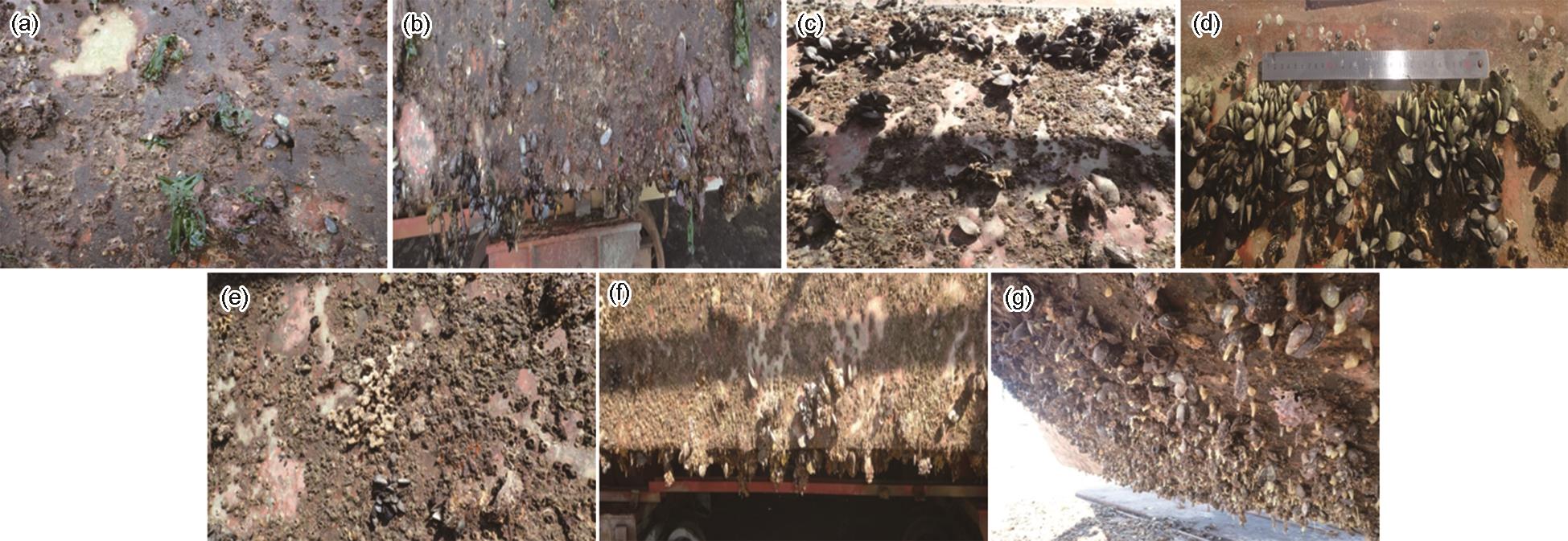 Fig.8 Fouling organisms community at middle part of the hull (a) and lower part near bottom (b) on startoard; portside (c), upper waterline area (d), and middle part of the hull (e), and lower part near bottom (f) on portside; and (g) Bow |