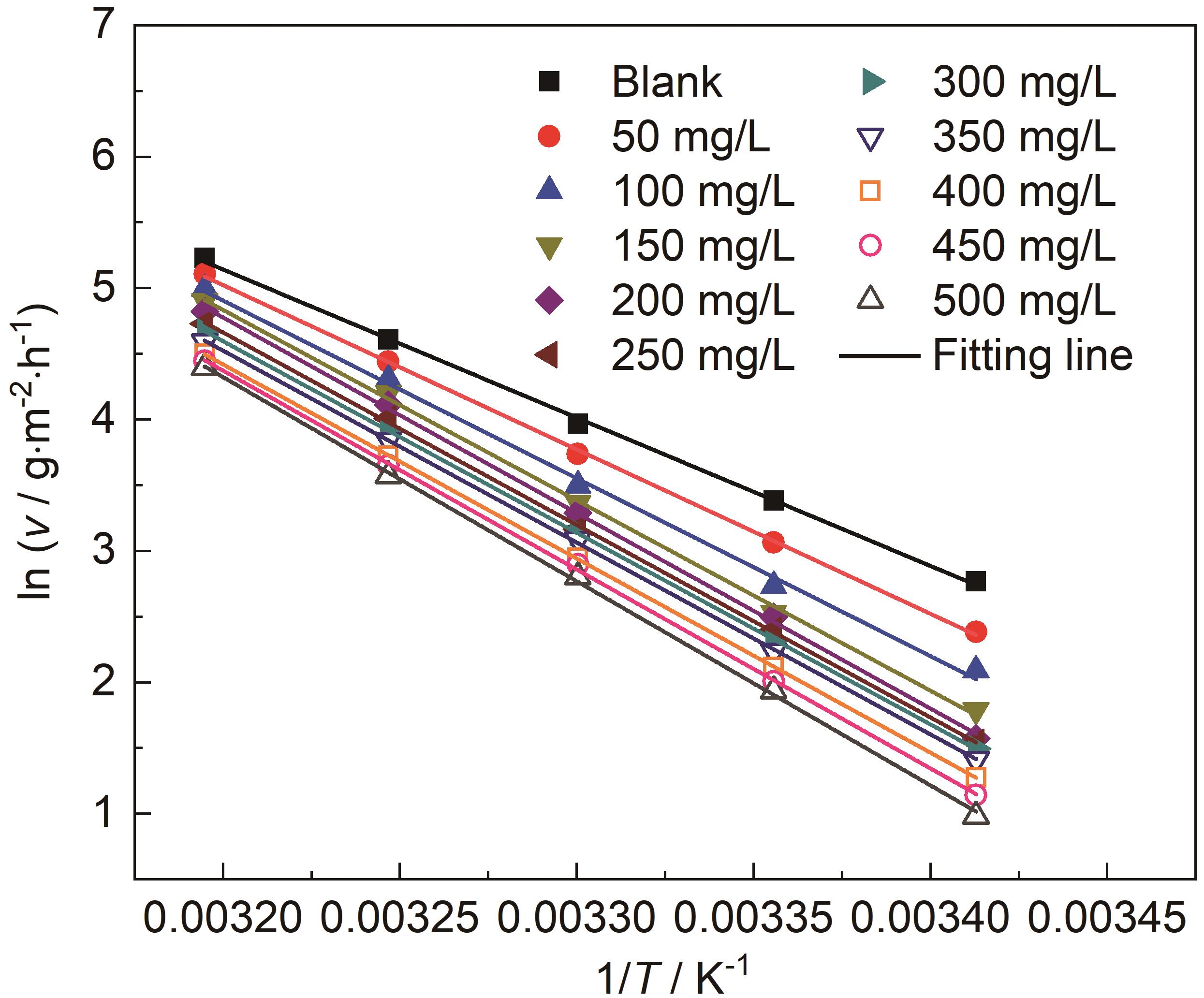 | 图4 不同温度下1.0 mol/L盐酸溶液中lnv-1/T的拟合直线 |