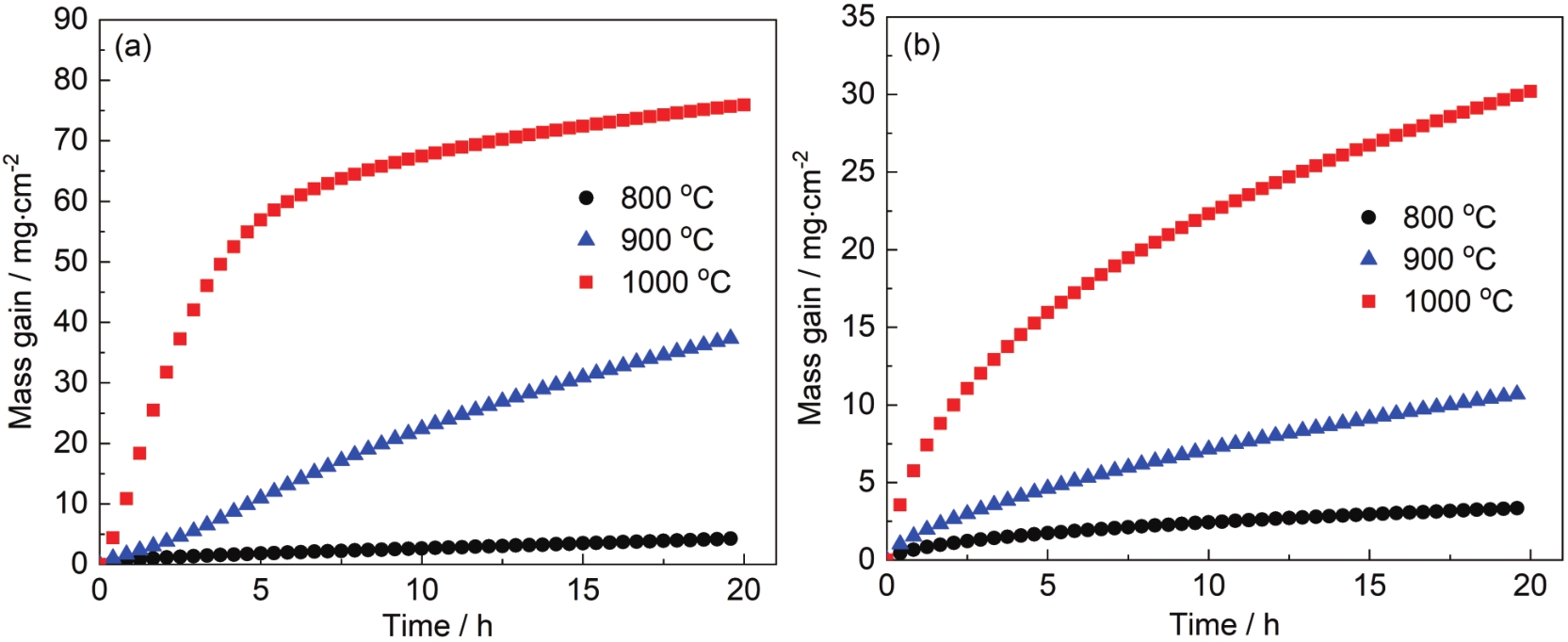 | Fig.3 Oxidation kinetic of Co-20Ni-3Al (a) and Co-20Ni-5Al (b) in 105 Pa O2 for 20 h at 800, 900 and 1000 ℃ |