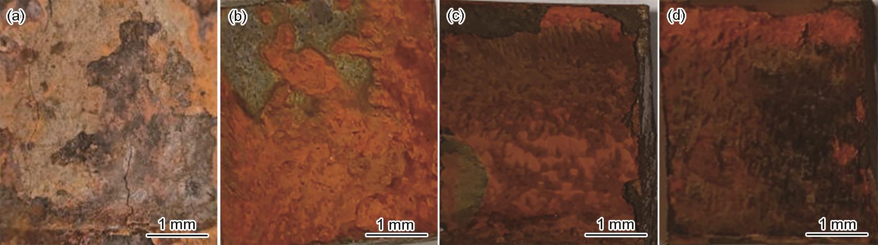 | Fig.6 Corrosion morphologies of coupled 20# steel after scouring in seawater with the flow rates of 0 m/s (a), 1 m/s (b), 3 m/s (c) and 5 m/s (d) |