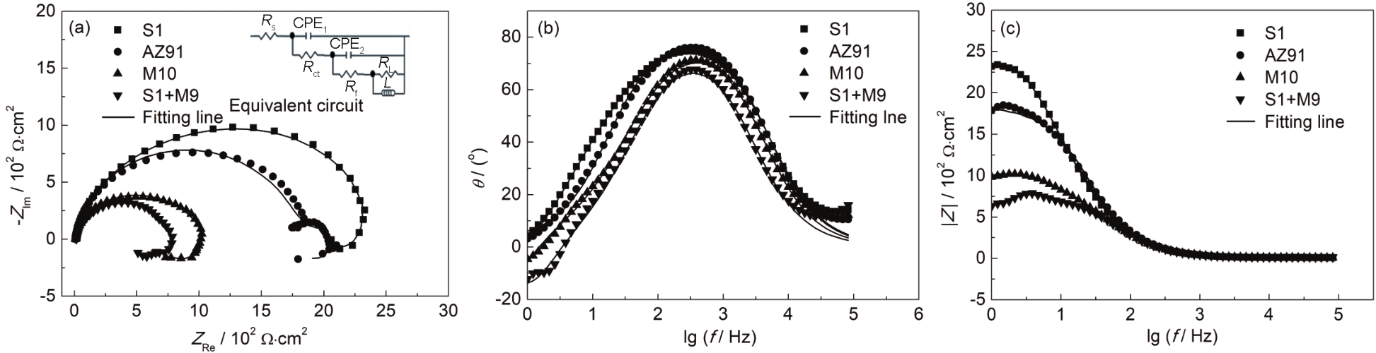 | Fig.5 Impedance curves of different materials in 3.5%NaCl: (a) Nyquist plots; (b) Phase angle-frequency plots; (c) |Z|-frequency plots |