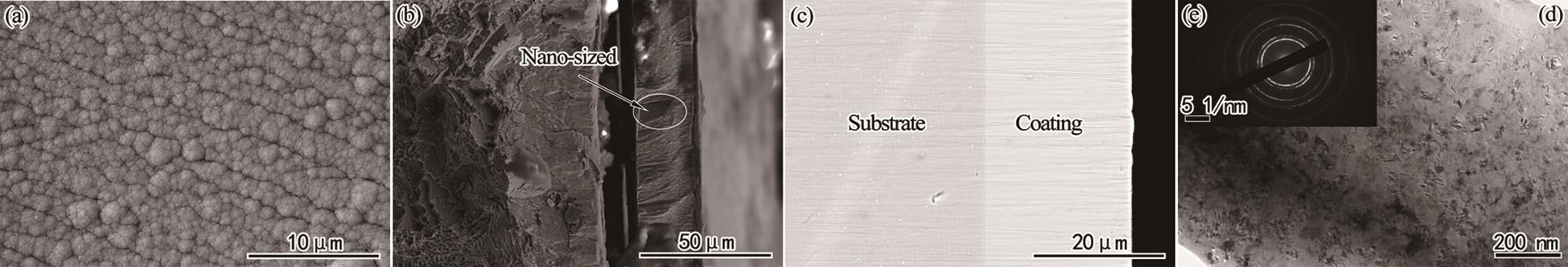 | Fig.2 Surface (a), fractured cross-section (b), polished cross-section (c) and TEM (d) images of the as-sputtered nanocrystalline coating, the inset in (d) shows selected electron diffraction rings (e) |