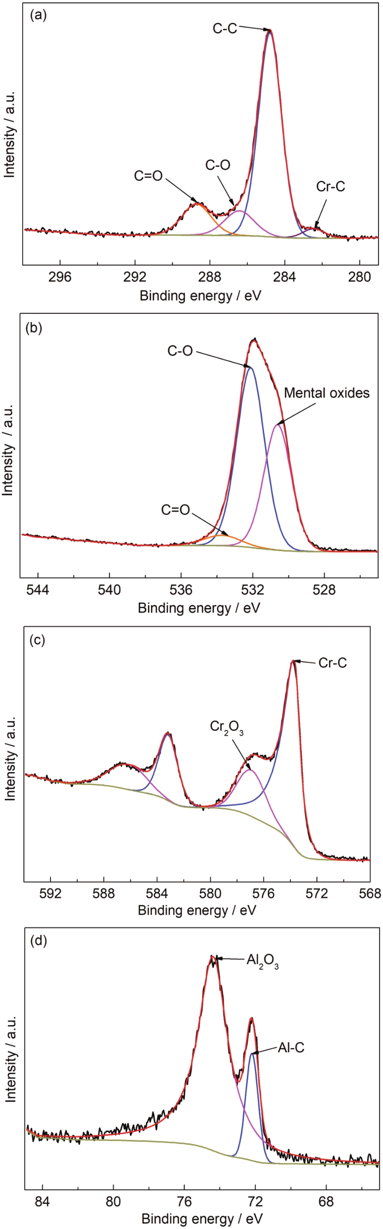 | Fig.3 High-resolution XPS spectra of Cr2AlC coating deposited on 304 stainless steel: (a) C 1s, (b) O 1s, (c) Al 2p and (d) Cr 2p |