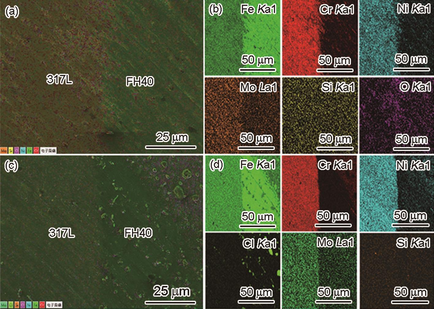 | Fig.5 Grinding crack photos (a, c) and EDS elemental mappings (b, d) of weld joint after wear tests under the conditions of dry friction in air (a, b) and seawater medium friction (c, d) |
