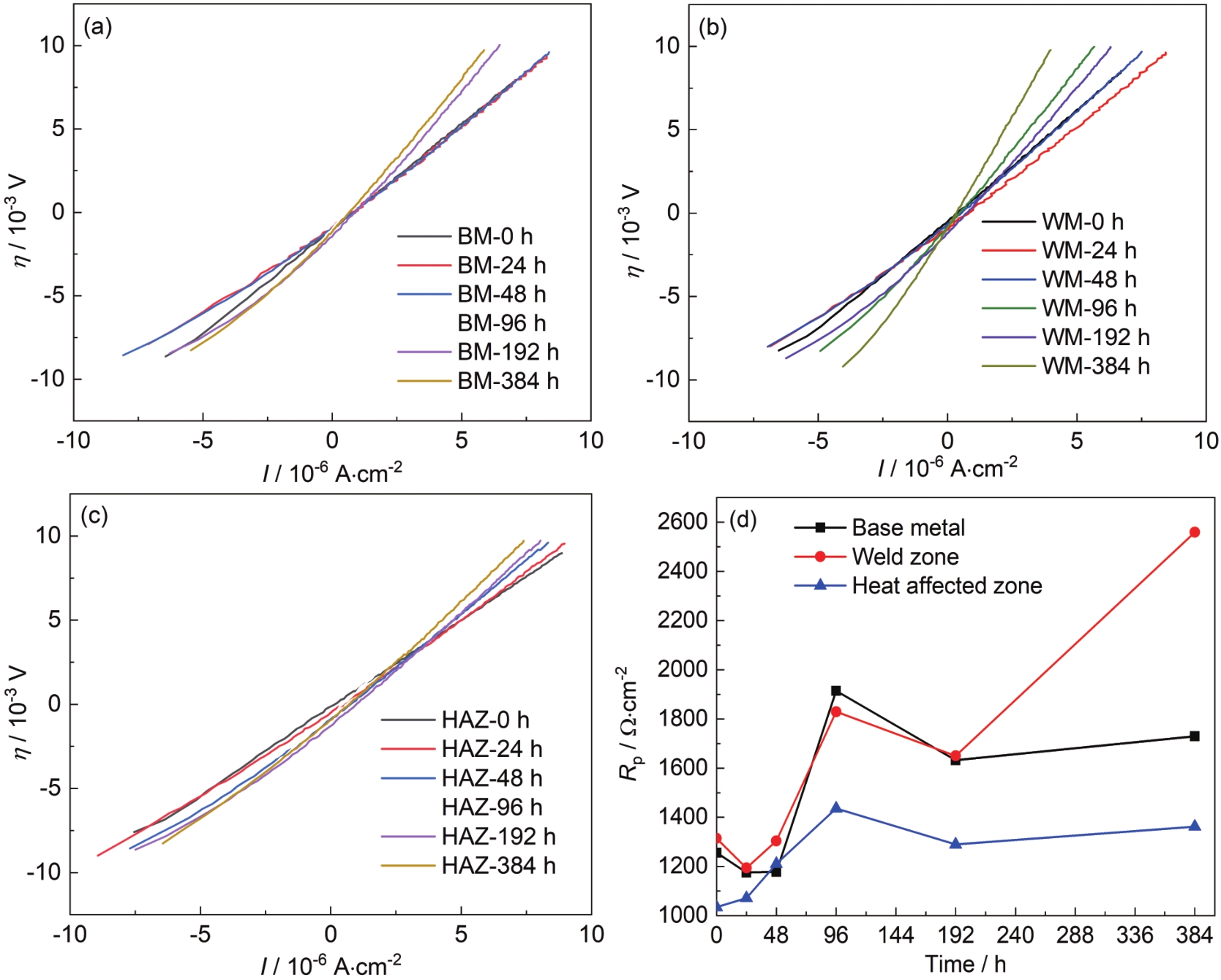 图8 焊接接头不同区域线性极化电阻随时间变化曲线 |