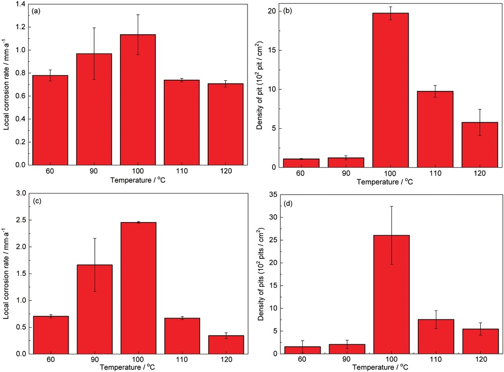 Fig.7 Localized corrosion rates (a, c) and pit densities (b, d) obtained from 3D surface morphologies of N80 steel (a, b) and TP125V steel (c, d) after removing corrosion products |