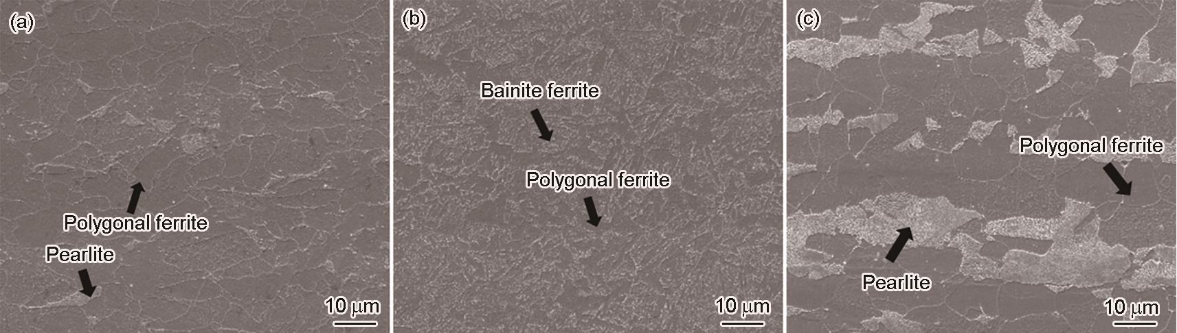 Fig.1 Microstructural images of new Cu-Mo test steel (a), Cr-bearing weathering steel (b) and Q355C steel (c) |
