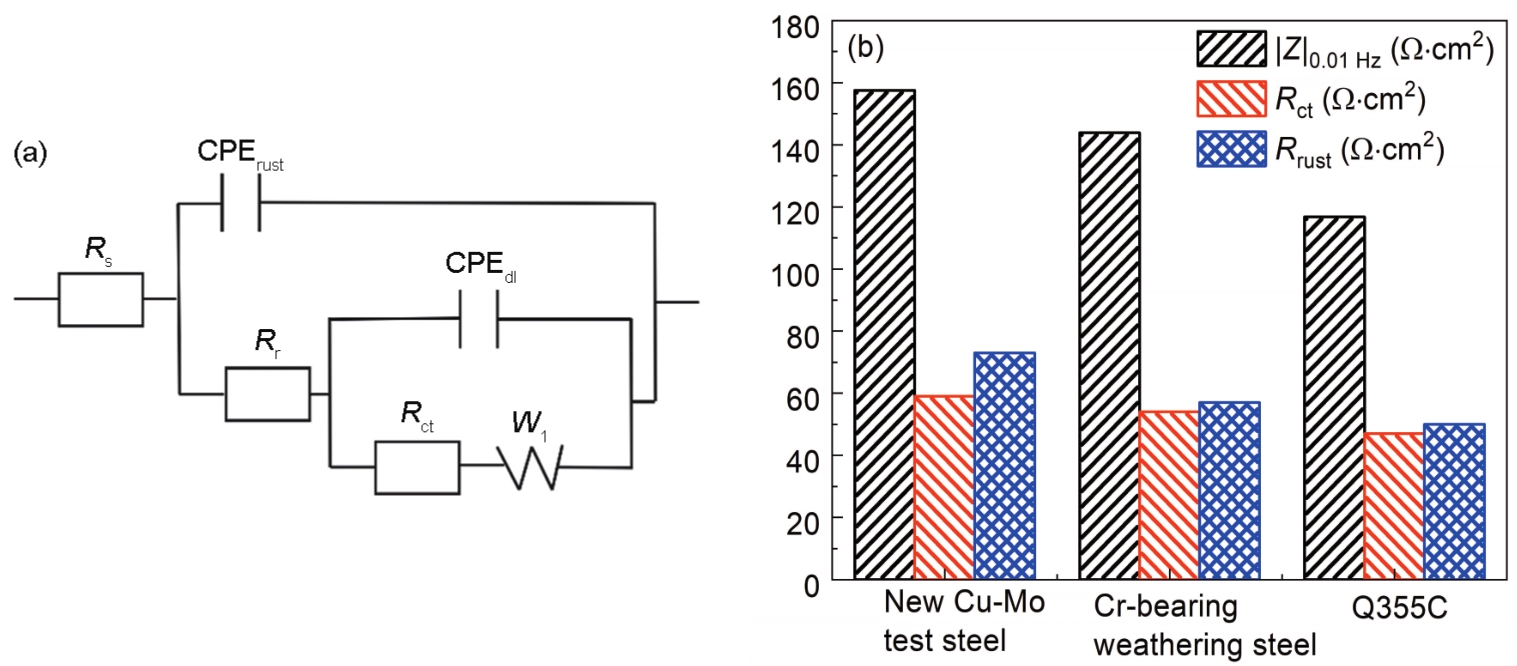 Fig.8 Equivalent circuit for fitting EIS spectra (a) and EIS fitting results (b) of three steels after 768 h corrosion |