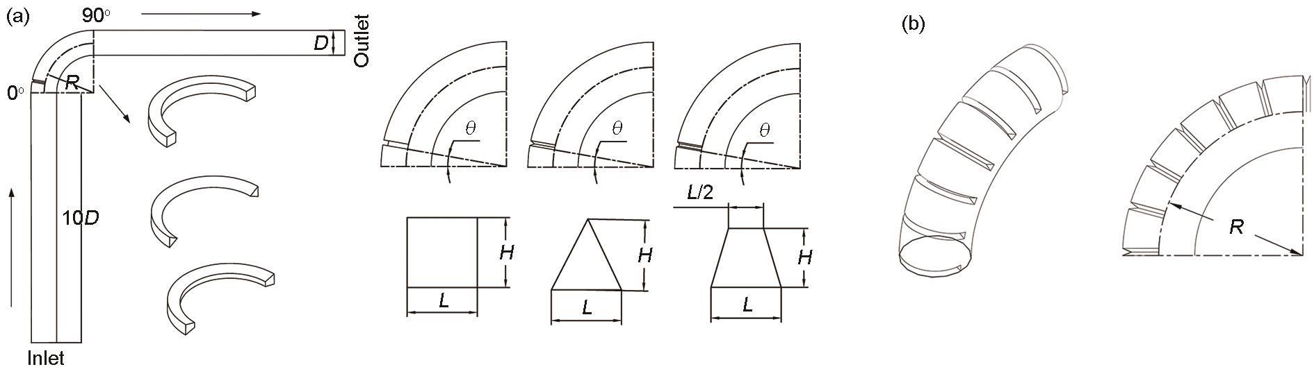 | Fig.2 Elbow geometry with rib of three different cross sections (a) and multiple rib (b) |