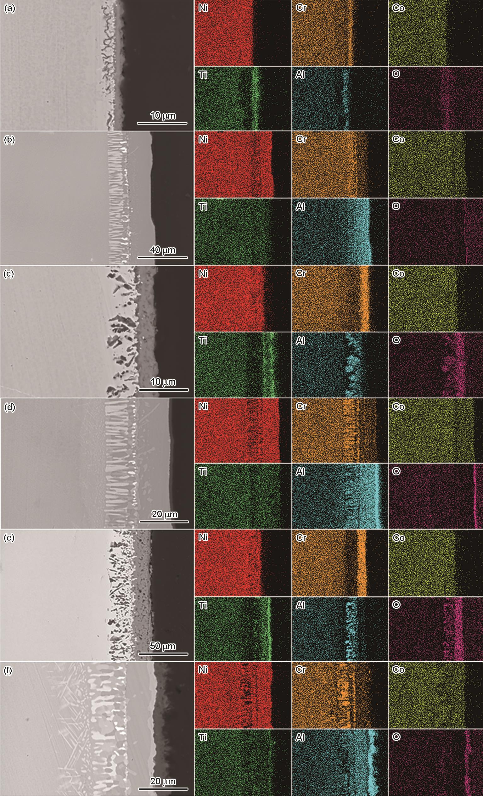 Fig.4 SEM cross-sectional morphologies and EDS elements mapping of K444 alloy (a, c, e) and CVD aluminide coating (b, d, f) at 750 ℃ (a, b), 850 ℃ (c, d) and 950 ℃ (e, f) after 300 h oxidation |