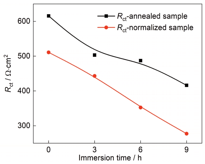 | 图9 两种热处理试样浸泡不同时间后的Rct变化曲线 |