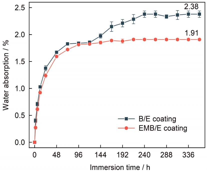 | Fig.6 Water absorption curves for B/E coating and EMB/E coating under the pressure-fluid coupled environment |