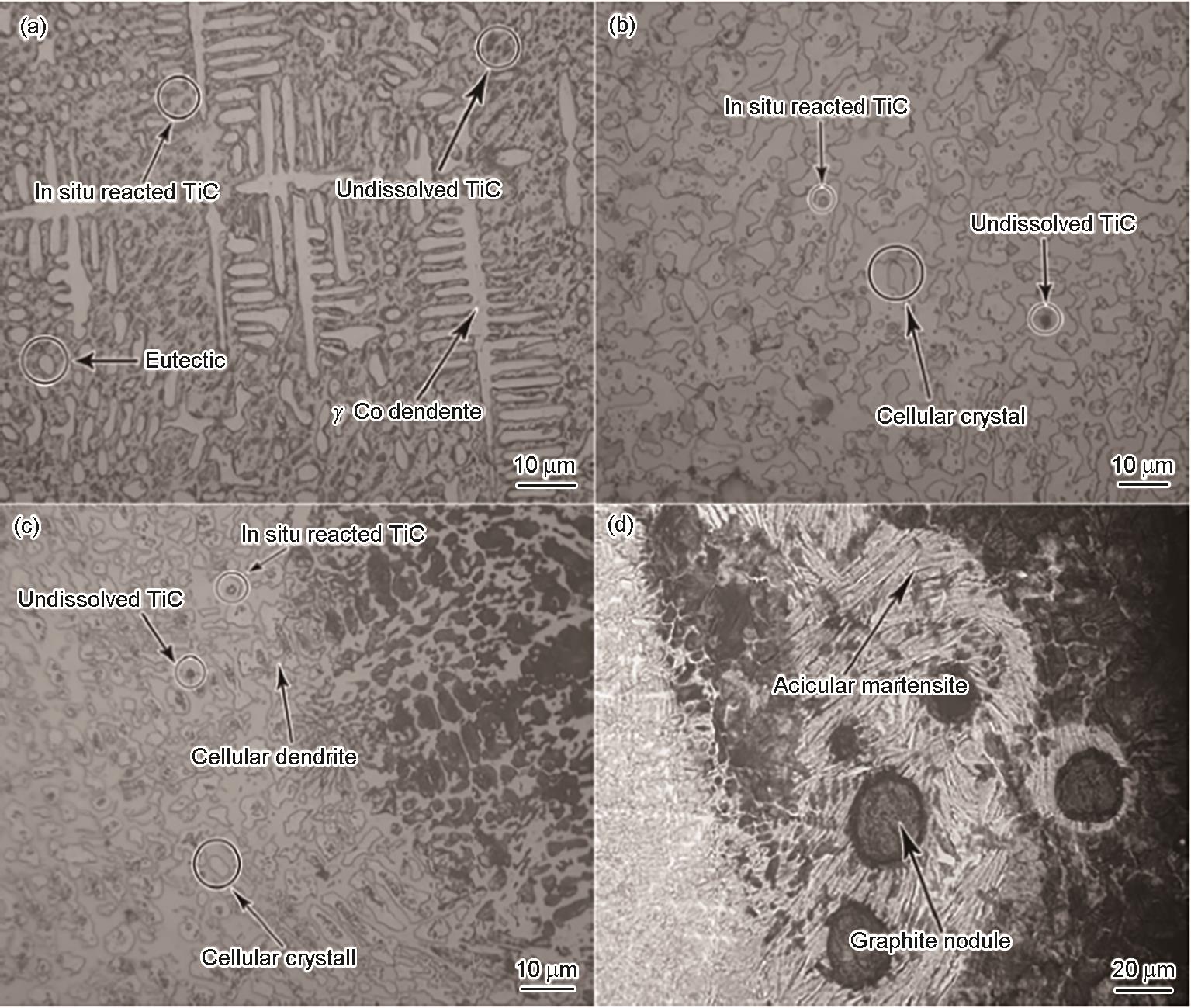 | Fig.2 Microstructures of 30%TiC/Co-based alloy laser cladding layer on ductile cast iron: (a) near surface, (b) middle zone, (c) combining zone, (d) HAZ[ |