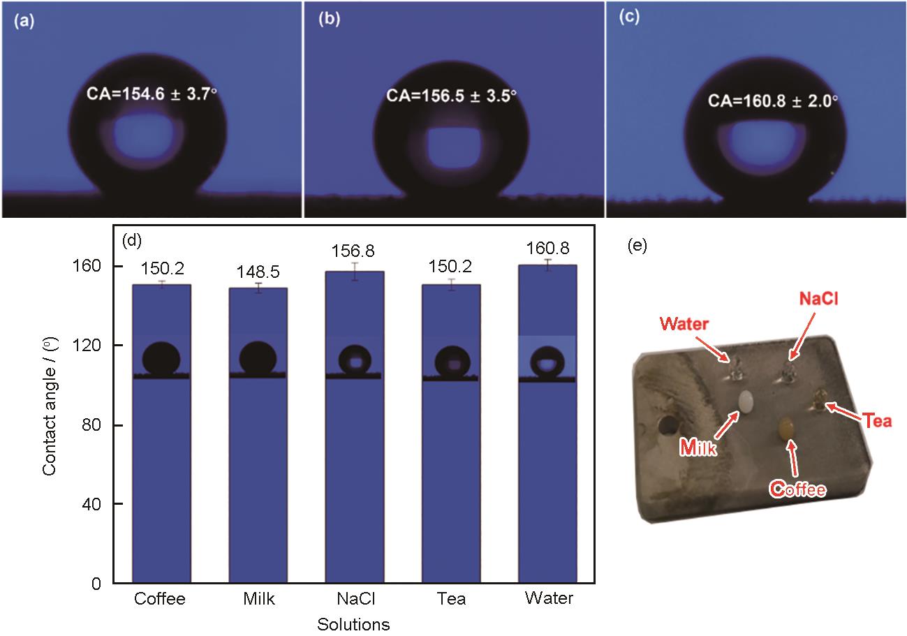 | Fig.5 Static water contact angles of ENP/NZSA-0 (a), ENP/NZSA-2 (b) and ENP/NZSA-5 (c) coatings, static contact angles (d) and corresponding photographs (e) of ENP/NZSA-5 coating for coffee, milk, 3.5% NaCl, tea and water |