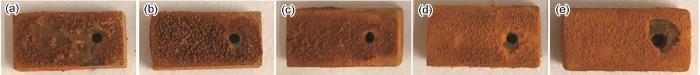 EH40钢在添加不同浓度硝酸盐的海水中浸泡12周后的表面腐蚀产物宏观形貌