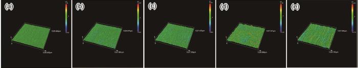 Surface CLSM images of EH40 steel with removal of corrosion products after being immersed in seawater without nitrate addition for 1 (a), 2 (b), 4 (c), 8 (d) and 12 (e) weeks