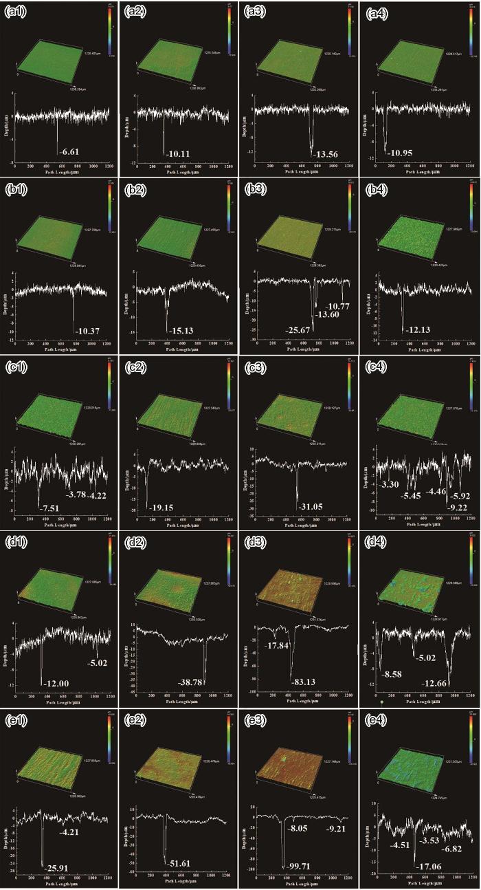 Surface CLSM images and corresponding maximum pit depth section profiles of EH40 steel with removal of corrosion products after being immersed in seawater added with 0.1 (a1-e1), 1 (a2-e2), 10 (a3-e3) and 100 (a4-e4) mmol/L nitrate for 1 (a1-a4), 2 (b1-b4), 4 (c1-c4), 8 (d1-d4) and 12 (e1-e4) weeks