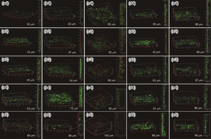 CLSM images of biofilms formed on EH40 steel immersed in seawater added with 0 (a1-e1), 0.1 (a2-e2), 1 (a3-e3), 10 (a4-e4) and 100 (a5-e5) mmol/L nitrate for 1 (a1-a5), 2 (b1-b5), 4 (c1-c5), 8 (d1-d5) and 12 (e1-e5) weeks