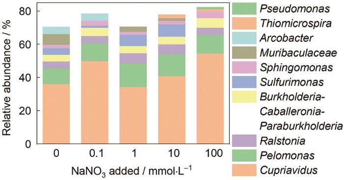 图10展示了在添加不同浓度硝酸盐的海水中浸泡12周后EH40钢表面微生物群落在属分类水平上的组成柱状图 (只显示丰度最高的10个菌属)。可以看出,在所有的海水体系中,EH40钢表面微生物群落丰度最高的菌属皆为Cupriavidus,其次为Pelomonas,隶属于这两个菌属的细菌可进行有氧呼吸 [16, 17]。Ralstonia、Sulfurimonas、Thiomicrospira和Pseudomonas菌属的细菌,既可在有氧环境下以溶解O2为电子受体进行呼吸,又可以在无氧环境下以硝酸盐作为电子受体进行呼吸 [18~23]。海水中未添加硝酸盐时,试样表面微生物群落结构中的硝酸盐还原菌属主要为Ralstonia和Sulfurimonas,其丰度分别为4.0%和3.9%。添加0.1和1 mmol/L硝酸盐时,硝酸盐还原菌属未发生变化,但Ralstonia的丰度分别变为4.2%和5.8%,Sulfurimonas的变为1.3%和6.7%。当硝酸盐的添加量为10 mmol/L时,除Ralstonia (5.8%) 和Sulfurimonas (7.4%) 外,出现了Thiomicrospira菌属,且其丰度为2.2%。进一步增加硝酸盐添加量至100 mmol/L,硝酸盐还原菌属主要为Ralstonia (4.3%)、Thiomicrospira (1.4%) 和Pseudomonas (1.2%)。硝酸盐的添加不仅引起了硝酸盐还原菌属类别的不同,还使得硝酸盐还原菌属的丰度发生变化,添加0、0.1、1、10和100 mmol/L硝酸盐时,其丰度分别为7.9%、5.5%、12.5%、15.4%和6.9%。