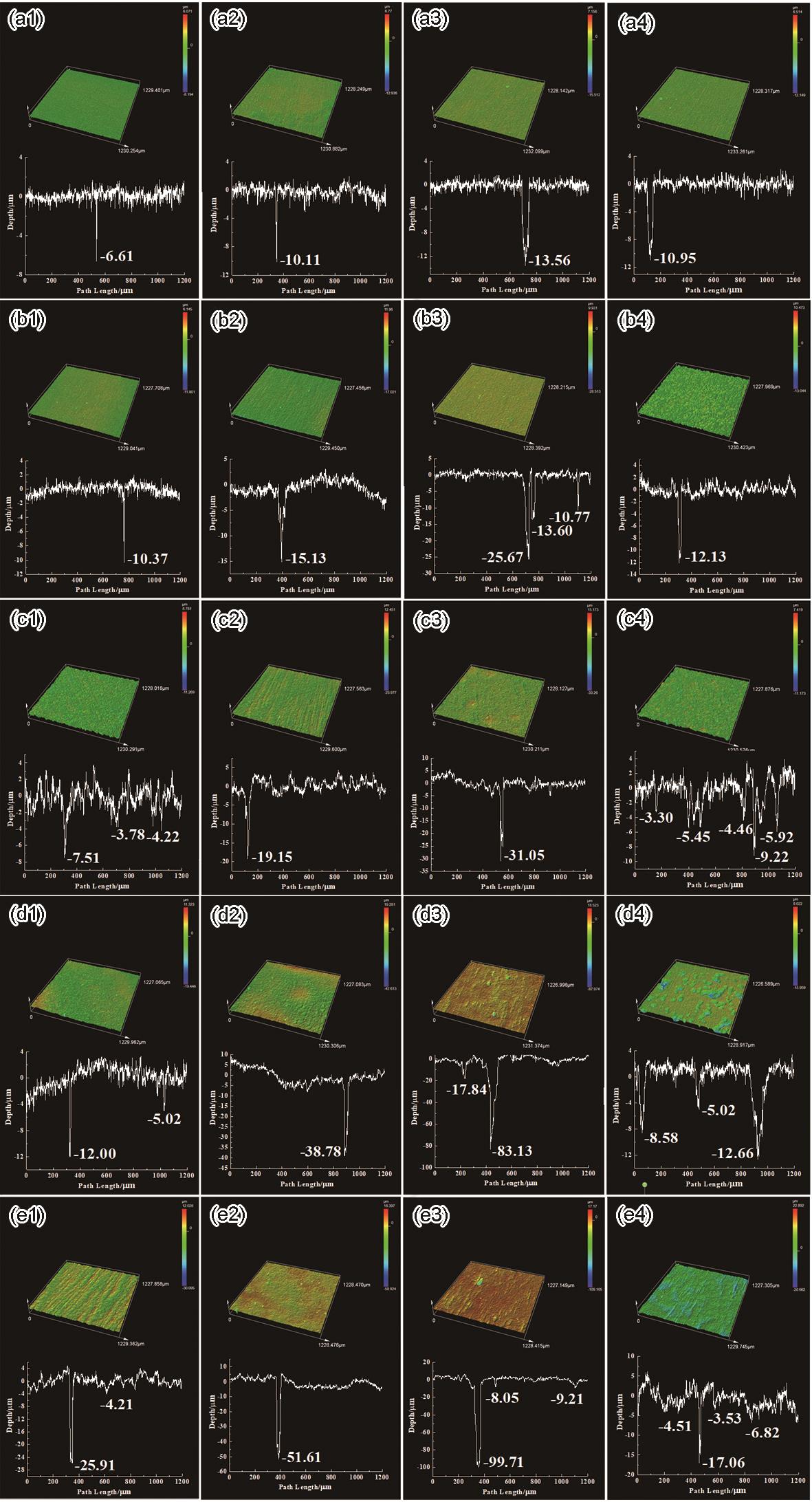 Fig.6 Surface CLSM images and corresponding maximum pit depth section profiles of EH40 steel with removal of corrosion products after being immersed in seawater added with 0.1 (a1-e1), 1 (a2-e2), 10 (a3-e3) and 100 (a4-e4) mmol/L nitrate for 1 (a1-a4), 2 (b1-b4), 4 (c1-c4), 8 (d1-d4) and 12 (e1-e4) weeks |