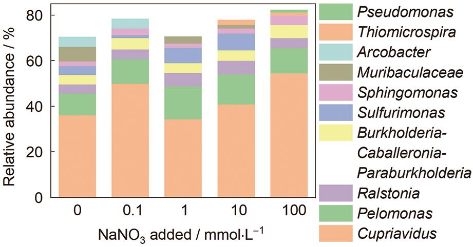 Fig.10 Histogram of microbial communities on EH40 steel after being immersed in seawater added with different concentration of nitrate for 12 weeks |