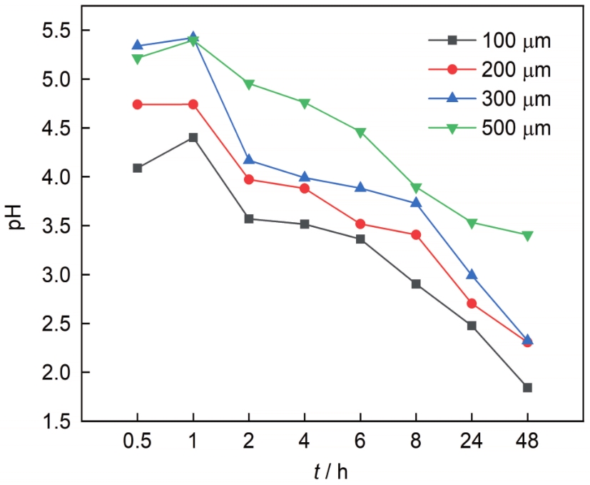 | 图11 201不锈钢在1 mol/L NaCl溶液 (pH=4.00) 中,不同缝隙宽度下缝隙内底部pH随时间演化图 |