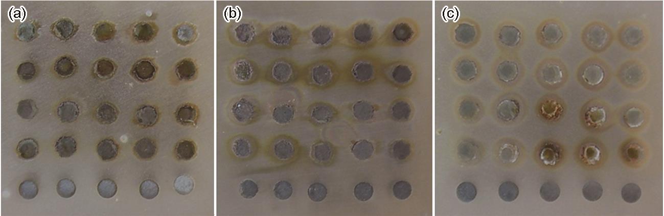 | Fig.10 Corrosion morphology of electrode wires at different positions after 168 h corrosion: (a) electrode A, (b) electrode B, (c) electrode C |