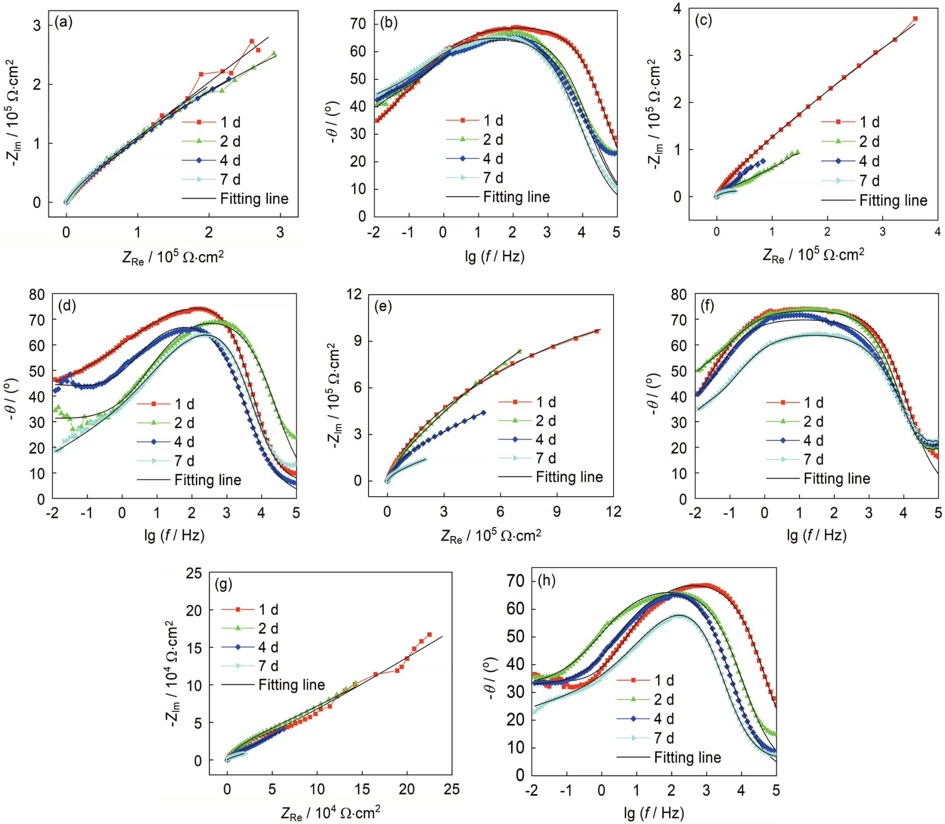 | Fig.5 Nyquist (a, c, e, g) and Bode-phase plots (b, d, f, h) of the SSS with different soaking times at 500 μm (a, b), 250 μm (c, d), 100 μm (e, f) and 50 μm (g, h) liquid film thicknesses |