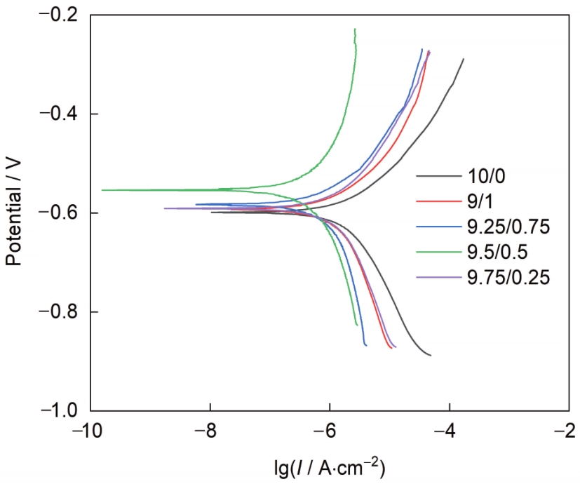 | 图9 不同比例SMCWA乳液/环氧树脂复合涂层的Tafel极化曲线 |