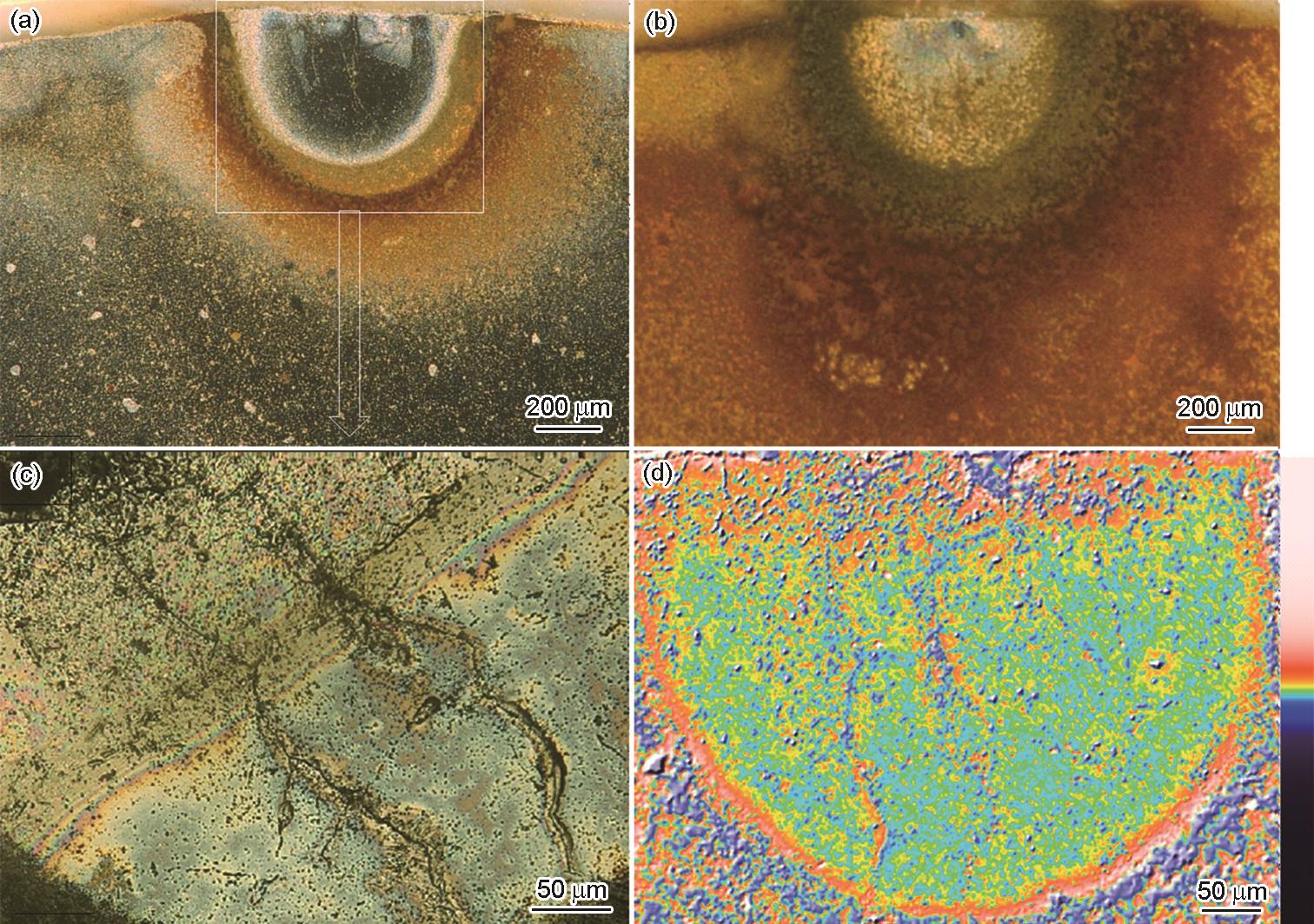 Fig.4 Local corrosion morphology of 4Cr16MoCu-250 ℃ tempered sample: (a) after 24 h, (b) after 168 h, (c) surface morphology after removing corrosion products, (d) surface morphology on 3D profilometer after removing corrosion products |