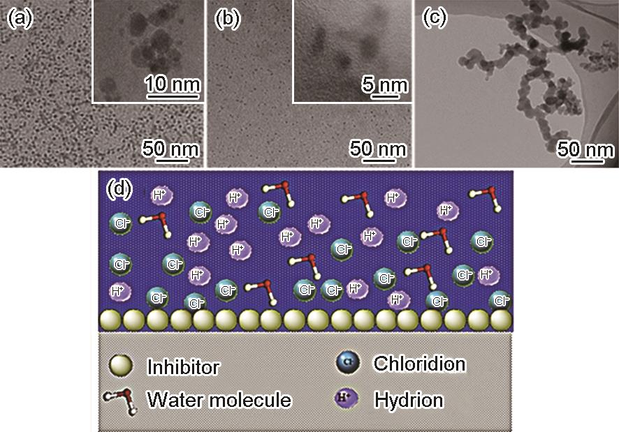 Fig.2 Morphologies of N-CDs1 (a), N-CDs2 (b),N-CDs3 (c) and schematic illustration of inhibition mechanism of N-CDs2 (d)[ |