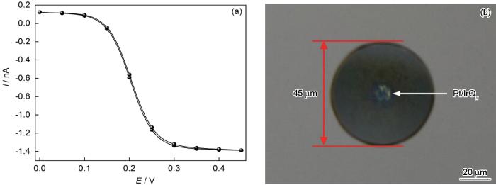 CV curve of diameter 10 μm Pt UME in 1 mmol/L FcMeOH+0.1 mol/L KNO3 solution (a), and optical photo of electrode surface after deposition of IrO x (b)
