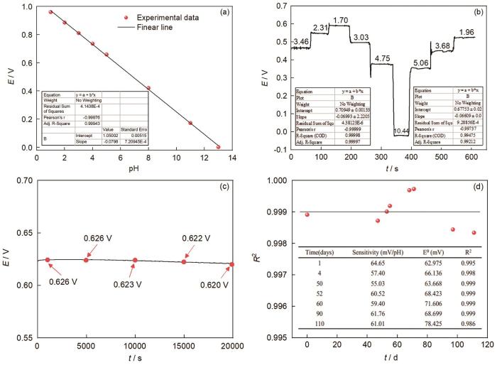 Response potential and fitting curve of Pt/IrO x -pH micro-sensor electrode at different pH (a), instantaneous response curve of the Pt/IrO x -pH electrode to pH change (b), short-term stability of the Pt/IrO x -pH electrode in 0.01 mol/L HCl solution (c) and long-term stability of the Pt/IrO x -pH electrode when placed in air (d)