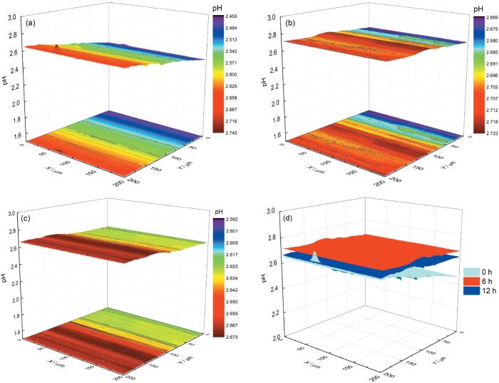 Surface scanning of 304 stainless steel in 3.5% NaCl solution with pH=2.00 after immersion for 0 h (a), 6 h (b), 12 h (c), and comparison of surface scanning of Pt/IrO x -pH microsensor electrode on 304 stainless steel with distance of 5 μm in the three immersion times (d)